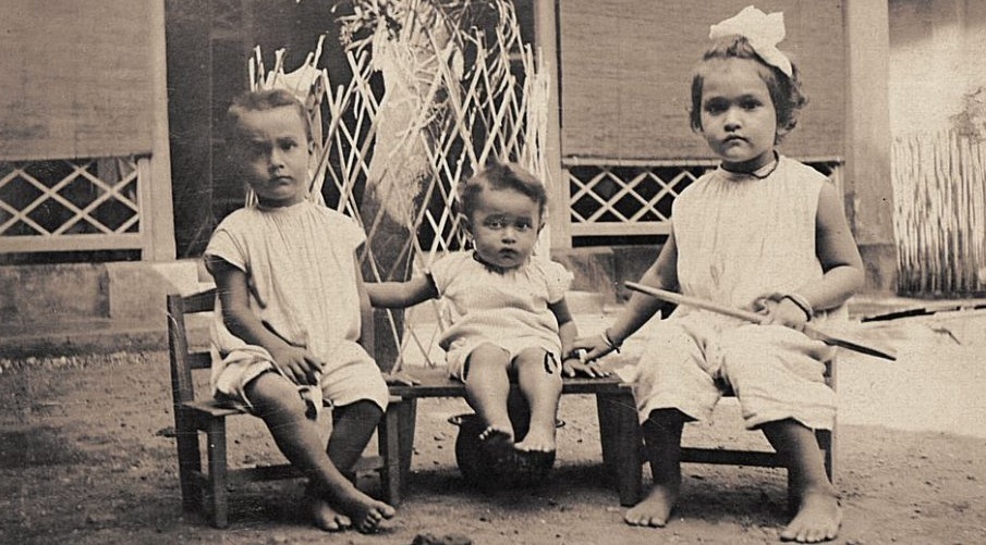 Met genoegen kijk ik naar het stilleven boven. Drie kleine kleutertjes kijken de toekomst in. Op blote kakken en in hansop. Gewichtig moment. Vader of moeder of oom Tjok maakt een foto. Vooral stilzitten. Ergens buiten beeld staat een gendoek te nonton. De Londohs hebben weer iets raars.