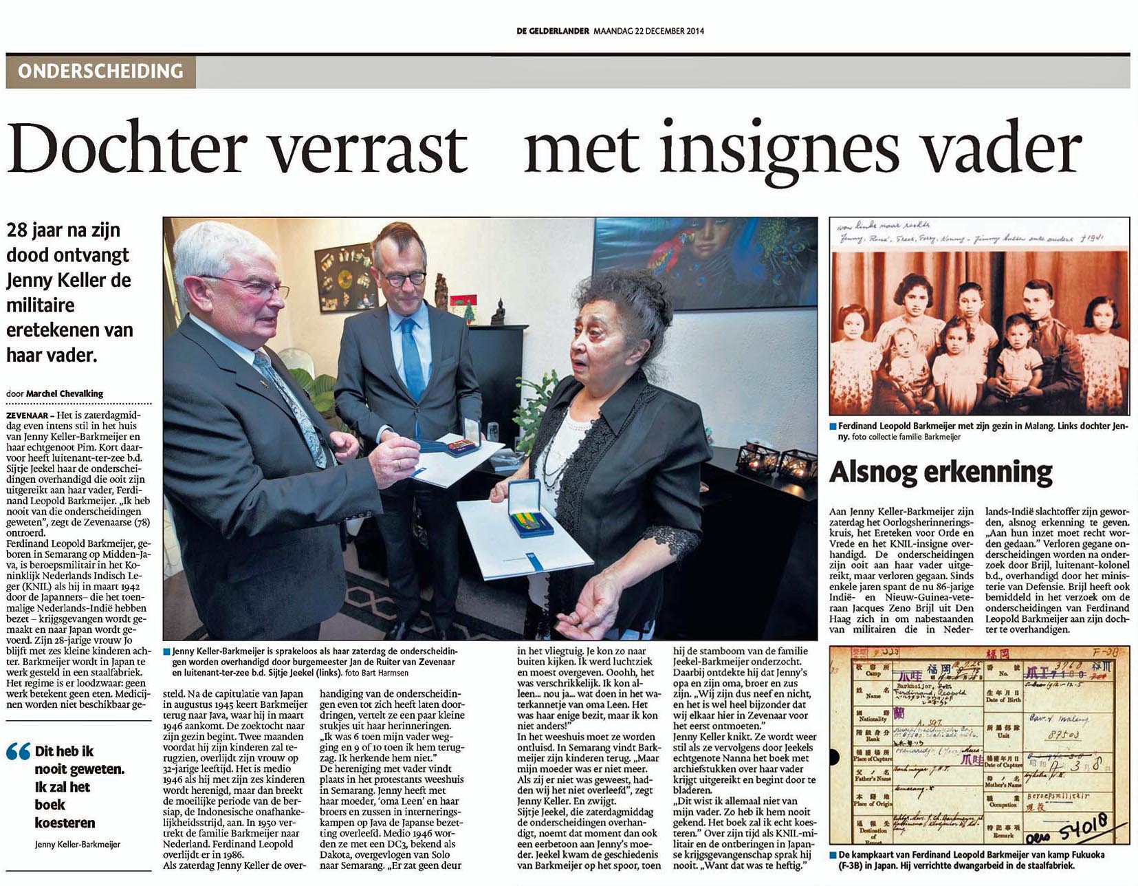 Bijna 28 jaar na zijn dood kreeg de Zevenaarse Jenny Keller-Barkmeijer (78) zaterdagmiddag de onderscheidingen overhandigd die ooit waren uitgereikt aan haar vader IAF.