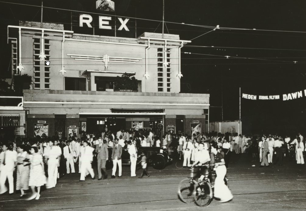 Mooie tekening van Peter van Dongen: bioscoop REX tussen 1946 en 1950 (?). Wanneer we die vergelijken met de foto uit 1939, valt op hoe in de tekening de E van REX er bijhangt.