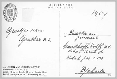 Het was een drukte van belang op de kade van Tanjung Priok. Handelaren, bemanningsleden, passagiers en heel veel koelies die de bagage van de passagiers de boot in sjouwden. Eindelijk was het dan zover. De scheepshoorn schalde en de Johan van Oldenbarnevelt voer de haven uit terwijl de scheepskapel het Wilhelmus speelde, uitgezwaaid door vele belangstellenden en begeleid door jubelende zeemeeuwen. De passagiers stonden wuivend aan de railing, menig traantje wegvegend. Denkend aan mijn geboorteland, dat ik waarschijnlijk nooit meer terug zou zien, sprongen ook bij mij de tranen in de ogen.