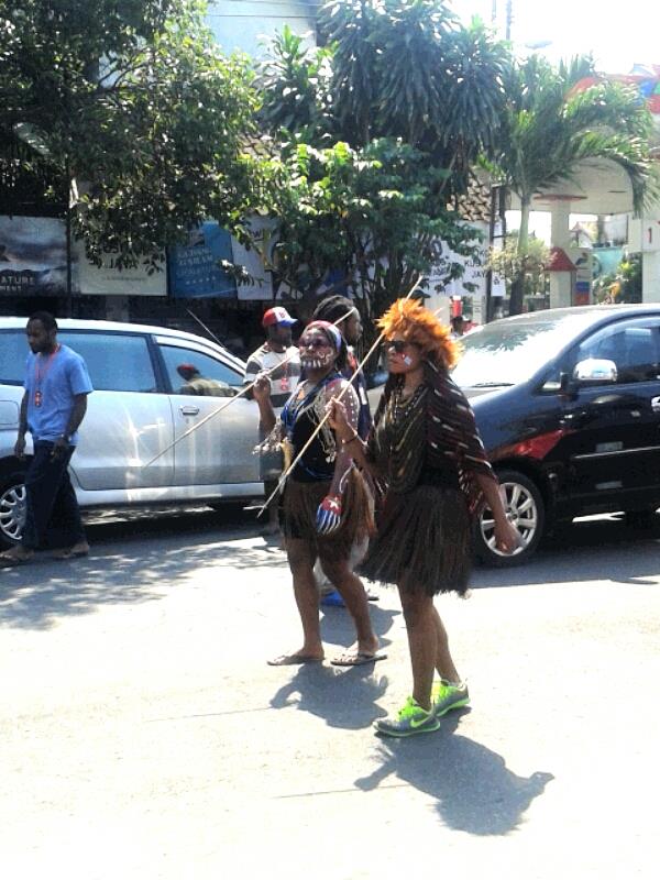 En onderweg naar de Indomaret vanochtend zag ik een Papua demonstratie waarbij men luid om “Merdeka!!” (vrijheid) riep. Papua-mannen met peniskoker op gymschoenen tussen de auto’s en brommers…