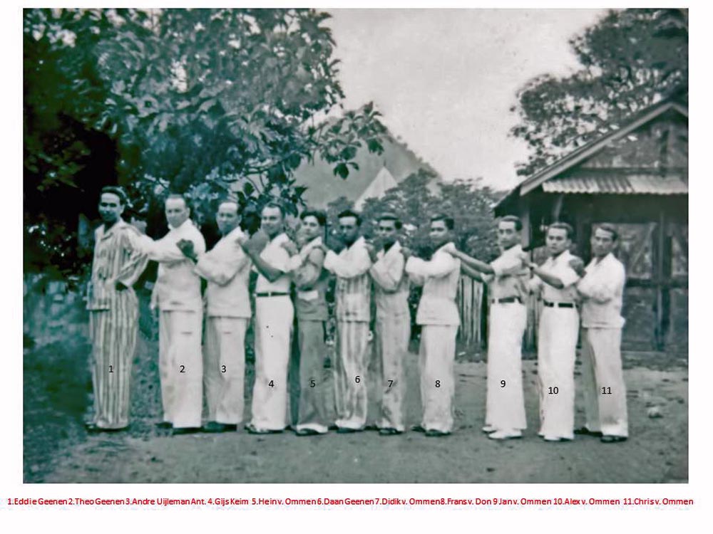 Mail: Ik dacht dat de aangehechte foto wel leuk is, want dat zie je niet gauw. Een familie uit Sawahlunto achter elkaar op lengte. En opname was van de goede oude tijd voor de oorlog. Ik heb de namen aan de onderzijde vermeld. En Eddie Geenen is mijn vader