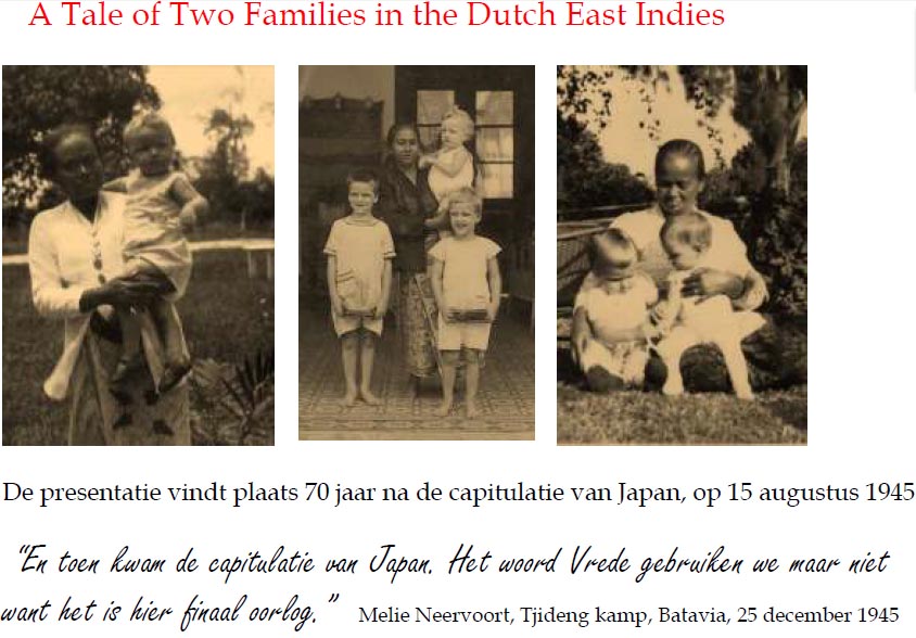 quote: Het boek beschrijft het leven van een gewone familie (mijn familie : Marlies) in buitengewone omstandigheden. Het begint in 1901 als mijn oma het Lutherse weeshuis intrekt. Daar ontmoet ze mijn opa, Bart Neervoort. Ze trouwen met de handschoen en zij volgt hem naar Indië. Daar ontmoeten zij hun verwanten de familie Spoor. Anna en Melie zijn jeugdvriendinnen. Dan komt de Crisis van de Jaren dertig maar in Bandoeng komt men daar op inventieve wijze bovenop. Drie zoons zijn in Nederland als ons land door de Nazi’s wordt binnengevallen. Twee krijgen te maken met de Arbeitseinsatz, één, mijn vader vindt ‘werk’ bij Philips.