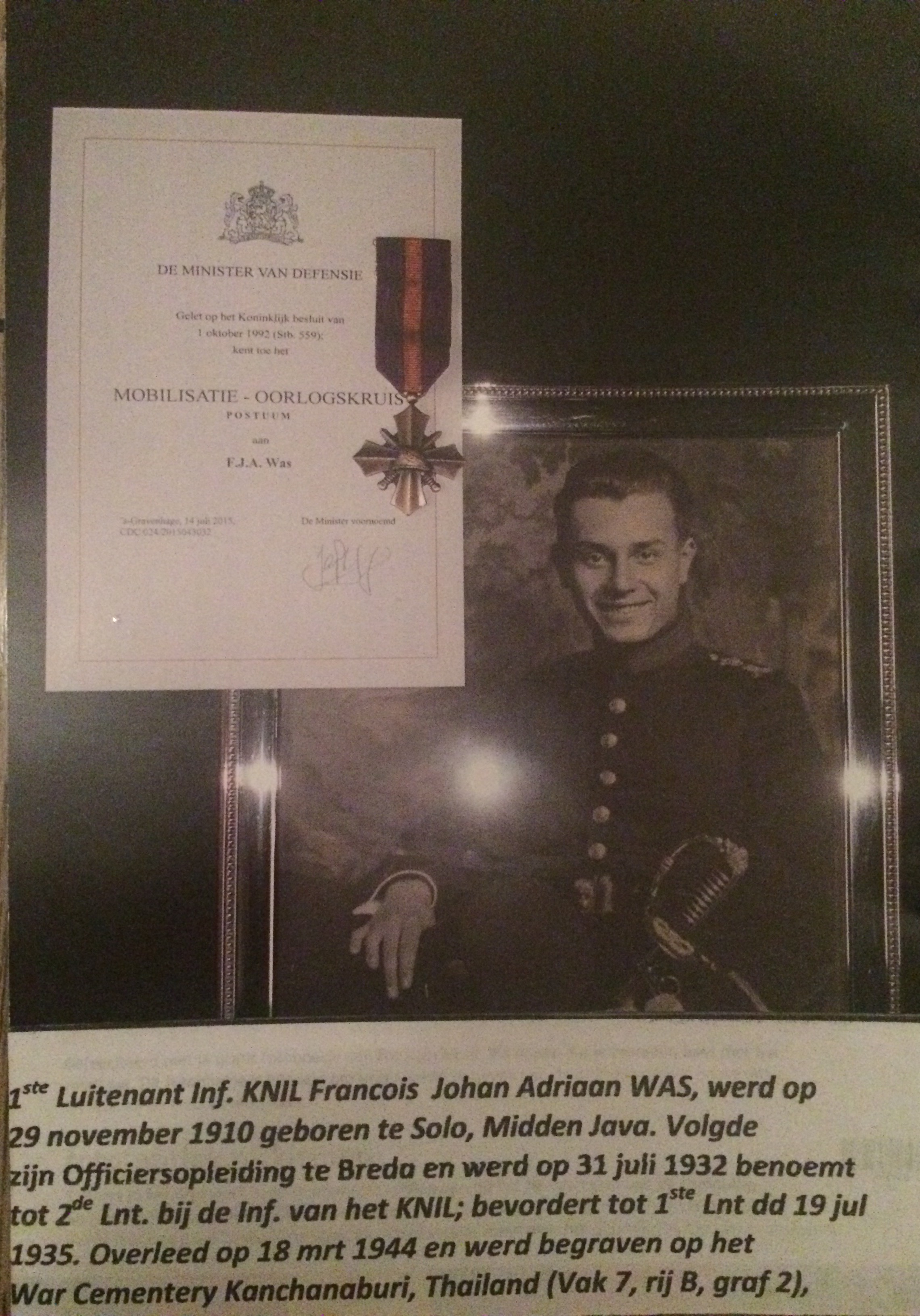 Heel veel dank , dat je de foto van wijlen 1ste Luitenant Inf. KNIL, F.J.A. WAS hebt geplaatst op de site van IvE ! Het is m.i. belangrijk dat deze veelal bijna vergeten groep in ” Indië geboren jongens”, die tijdens WOII hun leven verloren, meer bekendheid krijgen en de eervolle erkenning eindelijk mogen ontvangen waar zij al jaren recht op hadden. Zij liggen begraven op vreemde bodem, zoals bijv. in Maleisië, Thailand, Birma, Japan; soms zijn ze begraven op een Ere- begraafplaats,maar vaak ook in een onbekend graf of hebben zij een zeemansgraf gekregen in één van de zeeën in ZO. Azië.