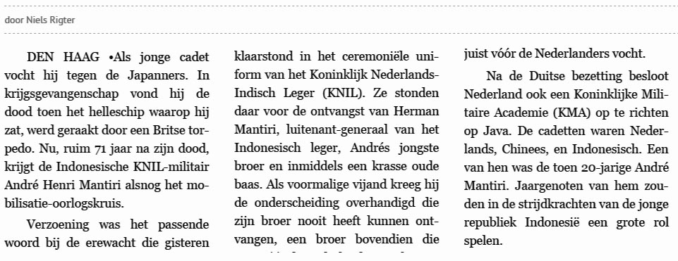Mijn respect aan de cadet-vaandrig KNIL Mantiri, en ook voor zijn familie( Ik weet,toevallig,dat er een vrij grote familie-delegatie Mantiri in Nederland is. .Hij die voor deze “bintang” heeft gezorgd,proficiat.Ik weet hoeveel werk je ervoor hebt verzet.Morgen herdenken mijn jongere broer en ik in ” besloten familie kring” de uitreiking van dezelfde medaille aan onze vader die in 1943 in de Molukken aan zijn einde kwam.Zal de woorden van Sue MacGregor in de britse Telegraph van 09/08/2012 zowel in het Nederlands als engels- voor niet nederlands sprekenden voorlezen-opdat iedereen beseft hoe Japan met zijn krijgsgevangenen omging ( ” we don’t care if you work or not,as ALL of you are to die”=woorden Japanse kampcommandant in de Molukken).De bittere herinneringen aan de Indonesische vrijheidsstrijd vervagen niet, maar vallen met de decennia,in beide kampen, in een ander licht.