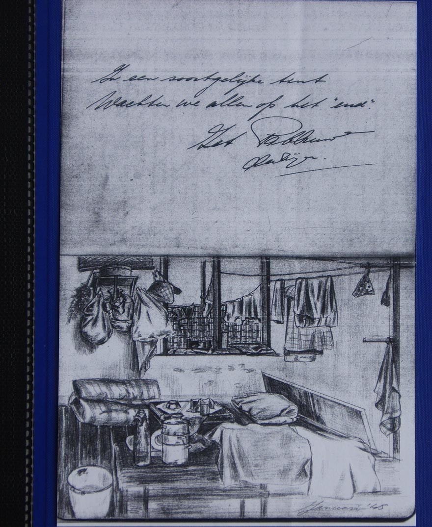 Op een dag keek ze naar wat Kamp memorabilia van haar intussen overleden Moeder en tot haar grote verbazing vond ze een tekening met de naam van mijn Moeder er op. Ze kopieerde de tekening en nu heb ik de copy.