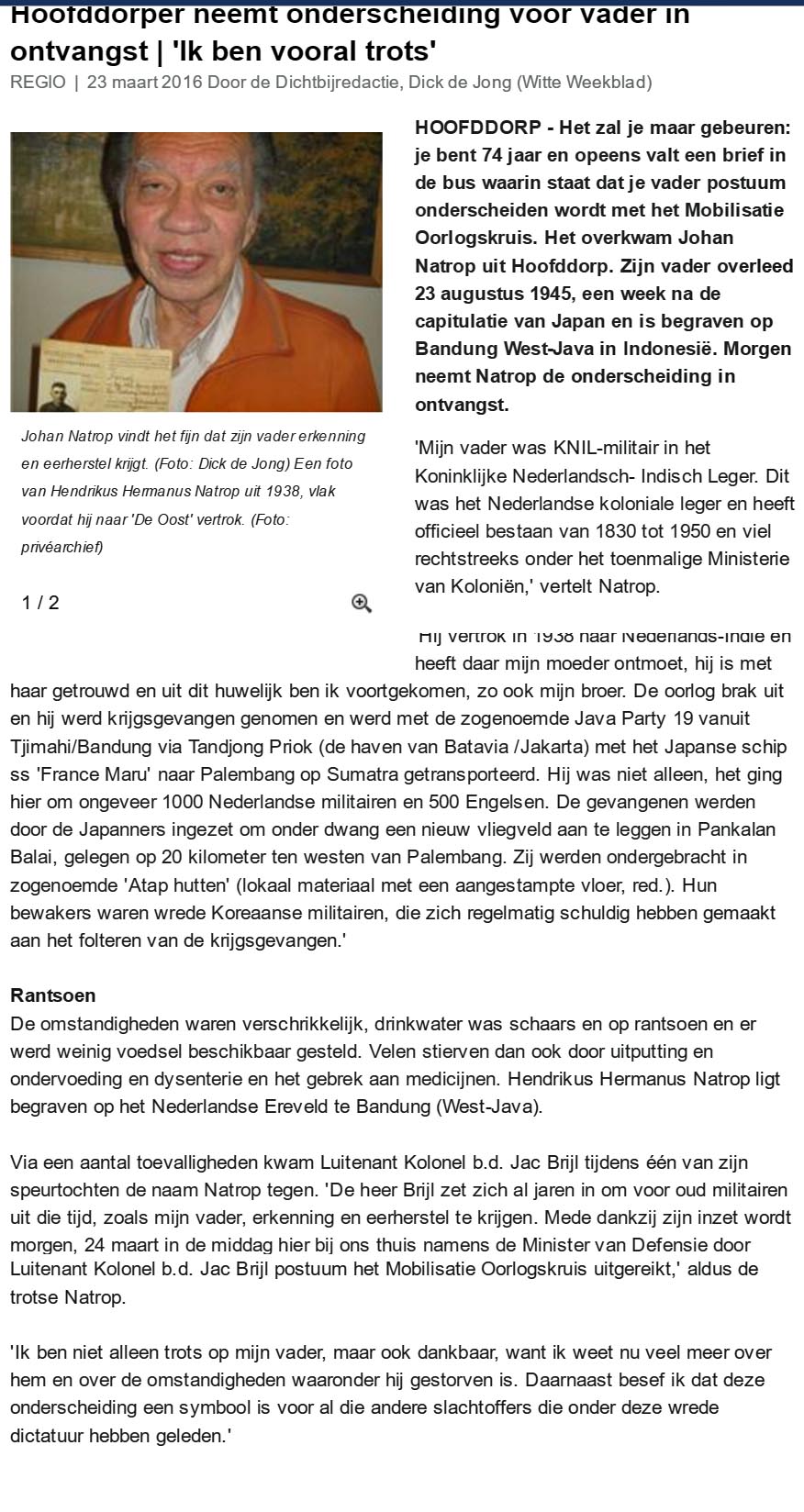Ik zie dat de familie Natrop net als de mijne ook uit Bandung afkomstig is en dat hun vader/echtgenoot op het ereveld Pandu zijn laatste rustplaats heeft gekregen, waar ook mijn vader na wat vijven en zessen een herdenkingsbord heeft gekregen.