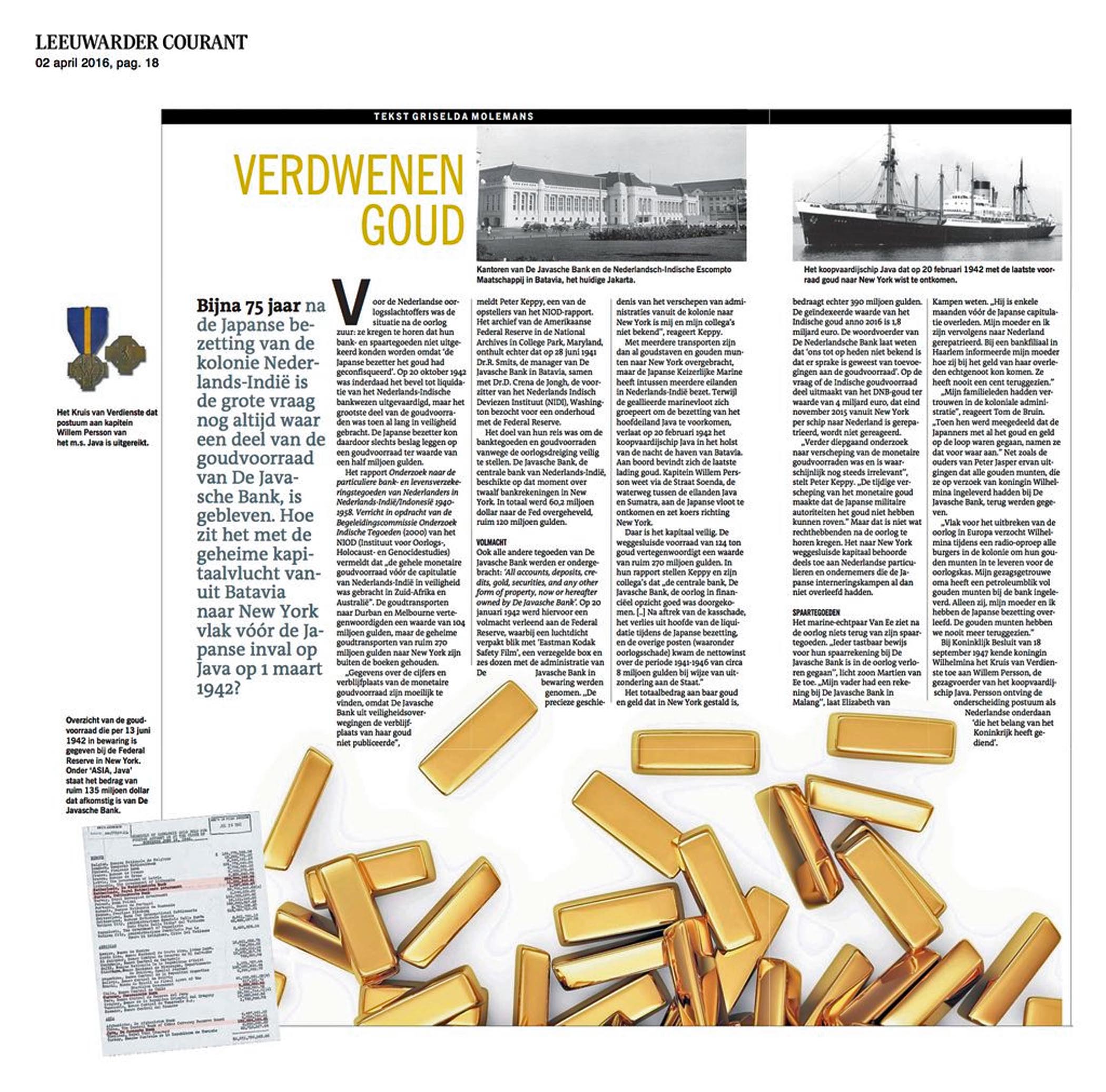 “Onbekend feit: vanuit Batavia zijn met meerdere transporten goudstaven en gouden munten overgebracht naar de Federal Reserve Bank in New York.” Na afloop van de expeditie was het normaal bekend bij de mensen die oorlogsmaterieel ermee moesten betalen. En voorraden hulpgoederen. Niet alleen naar de VS, ook naar Australië en Zuid-Afrika. Het kwam onder beheer van Smits, directeur-secretaris van de Javasche Bank Toen mijn moeder vlak voor de capitulatie drie maanden salaris moest ophalen (kreeg ze betaald in muntgeld), vertelde die kassier dat de edelmetalen ( niet alleen goud) en het bankpapier al was weggebracht. In mei 1940 gebeurde dat ook in Nederland via Hoek van Holland. Dit zijn in oorlogstijd normale zaken, alleen geheim gedurende het transport.
