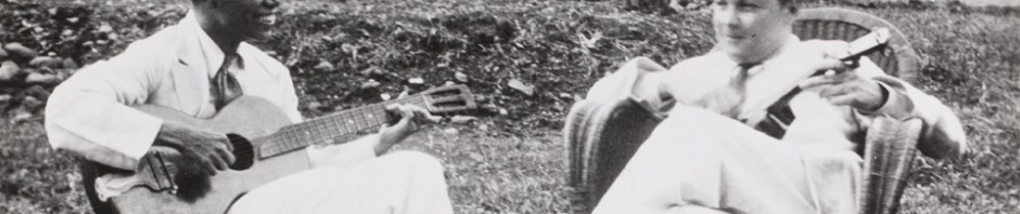 Een vluchtige blik op deze foto van E. du Perron herinnert me aan een scène waarin het hem verboden was omgang met krontjongende boeaja’s te hebben. Maar de schrijver is hier geen jongen meer. En die lachende gitarist, is dat geen boeaja van weleer, die zich inmiddels heeft ontwikkeld tot, zeg, iets fatsoenlijkers dan dat? Geeft hij Du Perron voor de lol een lesje in krontjong? Du Perron heeft plezier op de ukelele, maar enig talent verraadt zijn houding niet. Hij hoort achter een schrijftafel.