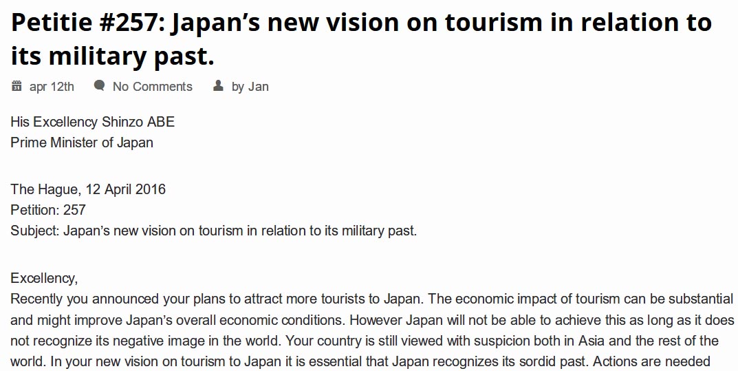 In uw nieuwe visie van toerisme voor Japan is het eerst noodzakelijk dat Japan zijn onverkwikkelijk verleden erkent. Aktie is vereist waarbij Japan met voorstellen naar voren komt om zijn onmenselijk oorlogsverleden te bekennen en compenstatie te betalen om de veroorzaakte schade te herstellen.