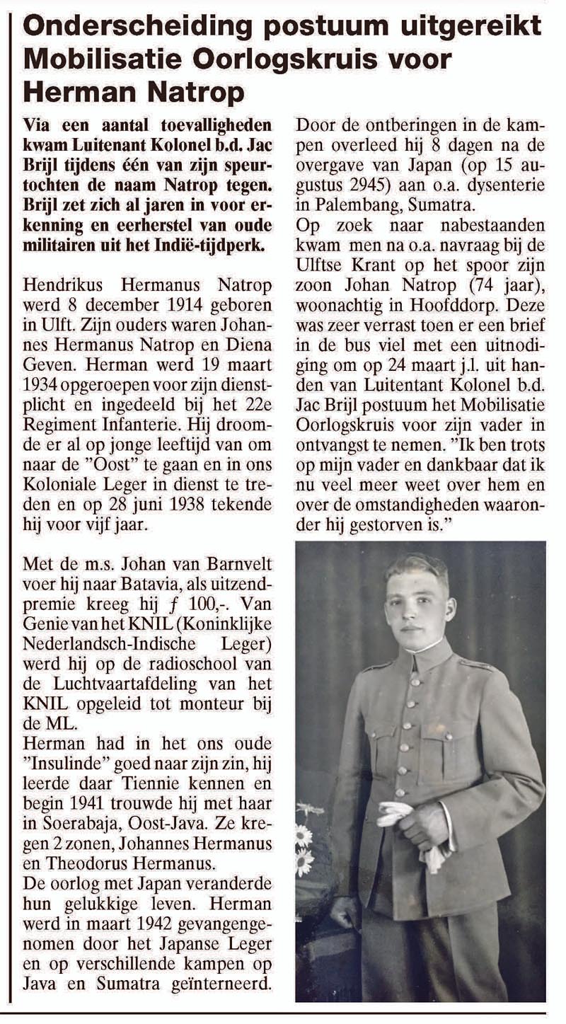 Allereerst wil ik je mede namens Mies hartelijk bedanken voor de gastvrije wijze waarop jij en je familie, ons hebben ontvangen. Voorts was het een eer voor mij, dat ik namens de mindef, de postuum toegekende onderscheidingen ( aan jouw vader en zijn broer) aan jou en je broer alsnog heb mogen uitreiken.