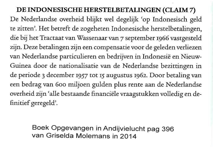 Ze begint op pagina 396 dit hoofdstuk Indonesische herstelbetalingen claim 7 met te schrijven dat ‘de Nederlandse overheid blijkt wel degelijk op Indonesisch geld te zitten’