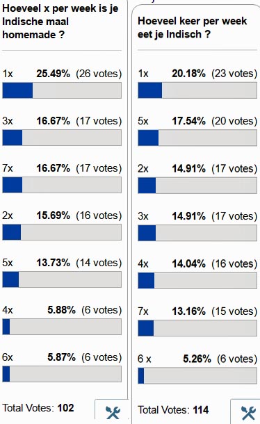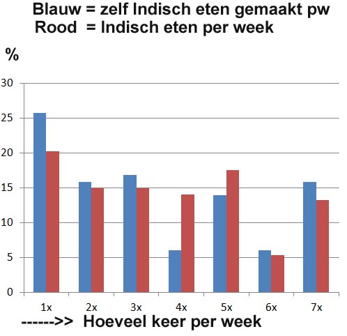 Een beetje vreemd eigenlijk. Behalve de 4x en 5x per week, wordt er meer indisch eten per week gekookt dan gegeten!. Vermoedelijk dat de 4x en 5x per week, meer eten van buiten halen?