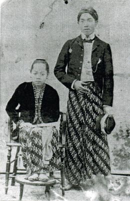 De familietraditie zegt dat de zittende vrouw de dochter is van een Soenan Pakoe Boewono. Het lijkt wel of ze een kris dwars op haar schoot heeft liggen.
