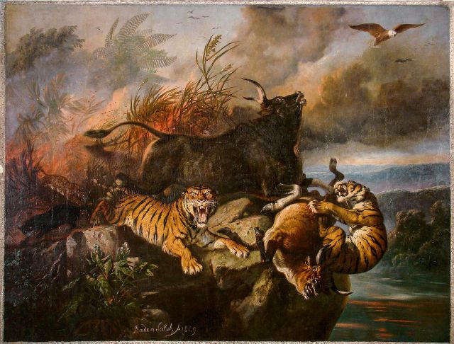 Dus …. was die Saleh met de wanhopige tijgers familiebezit – want geschonken door de schilder aan een voorvader persoonlijk of aan een voorvader in zijn ambt van Koning, c.q. staatshoofd en aldus aan het Nederlandse volk?