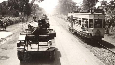Hierbij de bijschrift: Britse tanks patrouilleren in de straten van Batavia. Op de tram onafhankelijkheidsleuzen. (Opname: 29-10-1945) BeeldbankWO2/NIOD Het originele pers-bijschrift luidt: 'Tanks of C Squadron, P.A.V.O. (11th Frontier Force) parade through Batavia, 29th October, 1945. The tank 'Cushlan' with C.O. Squadron, Major B.P. Boyd, in Oude Tamarinde Laan'.