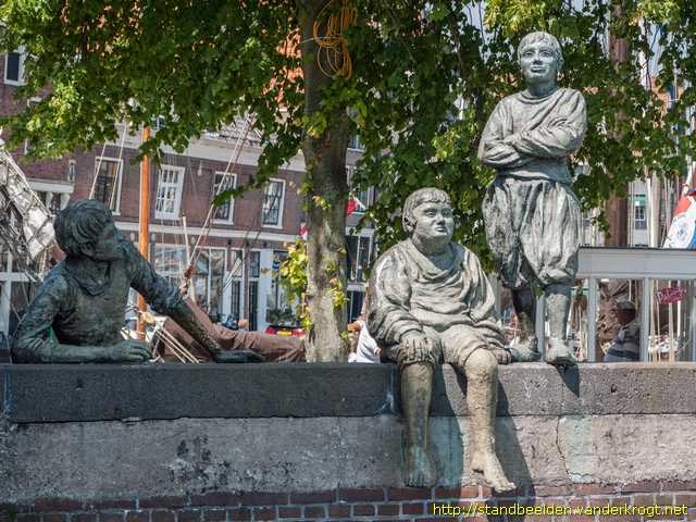 Bron foto en meer informatie: Beeldengroep van drie scheepsjongens, Hajo (?) staat op de kademuur, Padde zit erop en Rolf (?) leunt erop.
