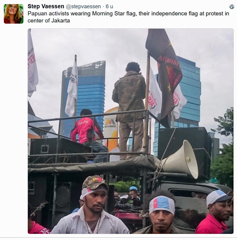 Het hijsen van de morgenstervlag is strafbaar maar het schijnt dat de Papoea ongestraft een morgenster bandana en T-shirt mag dragen. Of is dat ook strafbaar?
