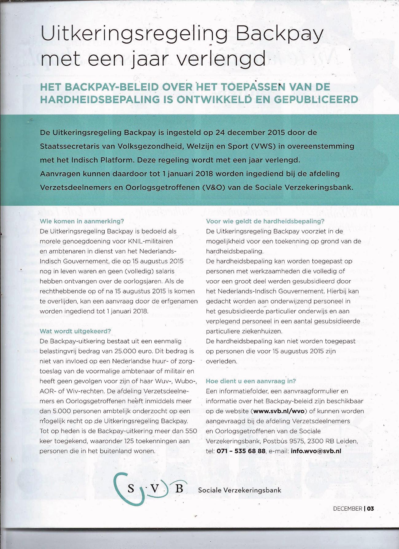 De Moesson van december heeft een paginagrote advertentie van de SVB .