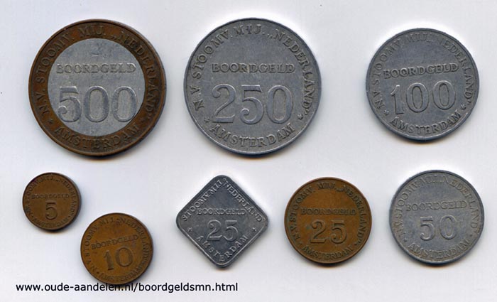 Bent u aan boord geweest op een van deze schepen? Of waren uw ouders aan boord? Dan komt het boordgeld u waarschijnlijk bekend voor.De SMN is overgenomen door de Nedlloyd en in hun archief lagen nog de boordgeld munten. U kunt nu een complete set van alle 8 munten aankopen voor € 40 (gratis verzending). Dit aanbod geldt zolang als de voorraad strekt. Kijk voor meer informatie op http://www.oude-aandelen.nl/boordgeldsmn.html
