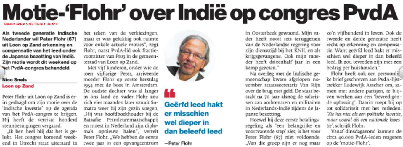 En mag ik uw aandacht vragen voor het 20/01/2017 artikel op de site “Theindoproject.org “Of old people and the things that won’t pass and the perfidous(=breach of loyalty) role of successive Dutch cabinets”.Speciaal het “breach of loyalty” sprak mij(zeker)aan.Wij werden geacht 100% loyaal te zijn t.a.v.onze “successive cabinets”.Maar de politici verloren al snel belangstelling voor “maar” 616,000 Indo’s(1984),waarvan 309,000 van de 1e generatie,en nu (geschat) nog maar 458,000 in Nederland wonen.Op 17,1 millioen inwoners is dat een,te verwaarloosbaar percentage.Dan kijkt men liever naar de percentages van “nieuwkomers”met geheel andere inzichten.Wat vaders/grootvaders,grootmoeders volbrachten wordt ondergebracht als “oud zeer”,wat zo snel mogelijk onder het (politieke)tapijt moet worden geveegd.