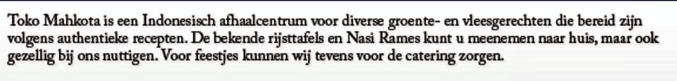Toko Mahkota adverteerd het gezellig nuttigen van rijsttafels en Nasi Ramis bij hun.