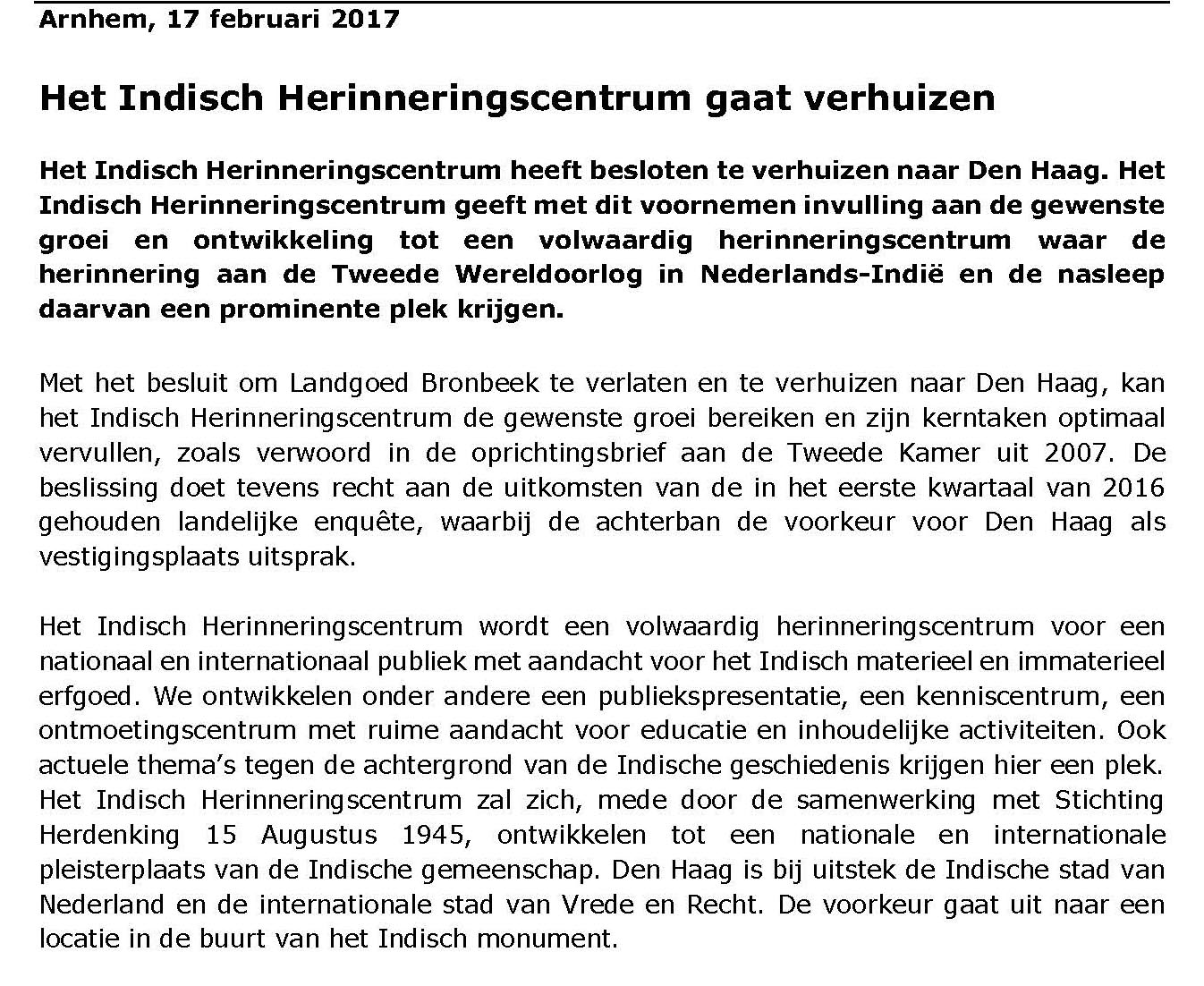 verhuizingfeb17herinneringscentrumpersbericht van het Indisch Herinneringscentrum (nog) Bronbeek.