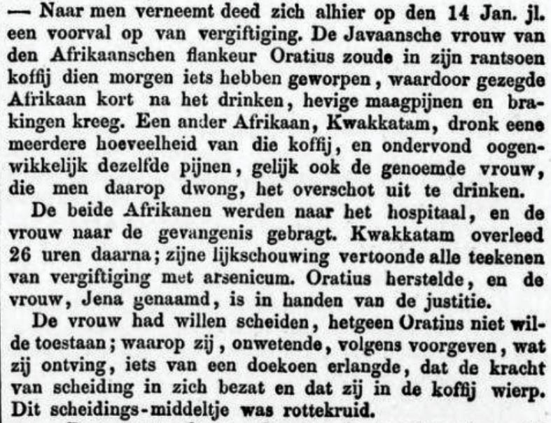 oratiusOp woensdag 16 februari 1853 haalde de zoveelste liefdesmoord in Indië op het nippertje de kranten. Dat was niet zozeer te danken aan de sensatie over de vergiftiging. Het lag vooral aan de klunzige omstandigheden. Het leek een stuiversromannetje. Een klucht. Wat was er gebeurd? historiek.net