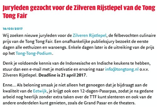 Moet je als jurylid nu gaan beoordelen wie in welke waroeng van de eetwijk het lekkerst heeft gekookt – of het nu Padangs, Midden Javaans, Madoerees, Makasaars, Dajaks, Soendanees, Minangkabaus, Palembangs, etc. is – of moet je het verschil kennen tussen rendang en kalio of nasi goedek for that matter?