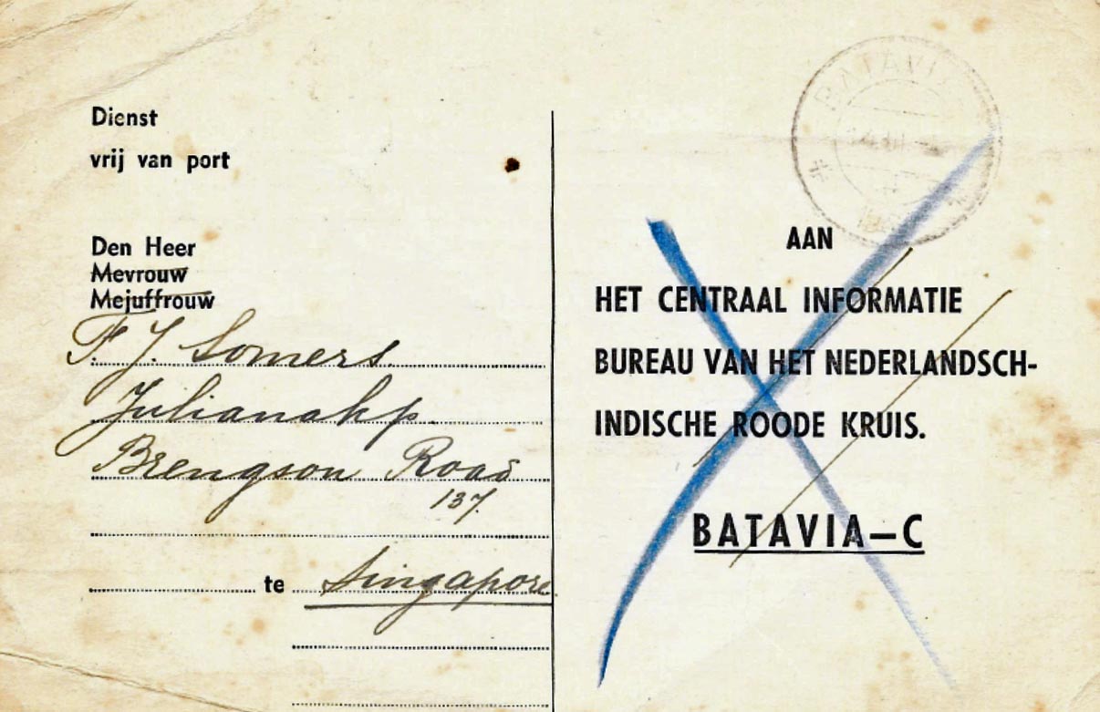 Mijn moeder en mijn zus waren in november 1945 uit Soerabaja weggevoerd, met onbekende bestemming het binnenland in. In een moeizame trektocht zijn ze ergens in Midden-Java terecht gekomen. In juni 1946 zijn ze door bemiddeling van het Rode Kruis vrijgekomen en naar Semarang gebracht, en vandaar uit naar Batavia. Uit haar bericht aan mijn vader blijkt dat ze niets van mijn broer en mij afweet. Wat ze van mij dacht te weten is dat ik in Soerabaja vermoord zou zijn in de Simpangclub. Interessant is dat het formulier is geadresseerd aan mijn vader in Singapore, maar een lange weg heeft afgelegd via Batavia, Vlissingen, het adres van de broer van mijn vader, naar Vlissingen, het adres van ons in Havendorp, de ons toegewezen noodwoning. Ook interessant is dat het formulier niet afkomstig was van het N.I. Rode Kruis, maar van het Rode Kruis in Genève. Het N.I. Rode Kruis was door de Engelsen ondergebracht bij RAPWI. Dat was niet naar de zin van het centrale Rode Kruis vanwege de ondergeschikte positie waarin het N.I. Rode Kruis zich nu bevond.
