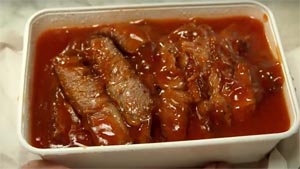 Char siu is een specialiteit uit Hong Kong en Kanton betekent letterlijk vertaald “vork geroosterd”. Lange, smalle repen rood, gemarineerd varkensvlees worden hangend aan haken/vorken geroosterd in houtgestookte ovens. Het is dus geen typisch thuisgerecht, want in China heeft niemand een eigen oven