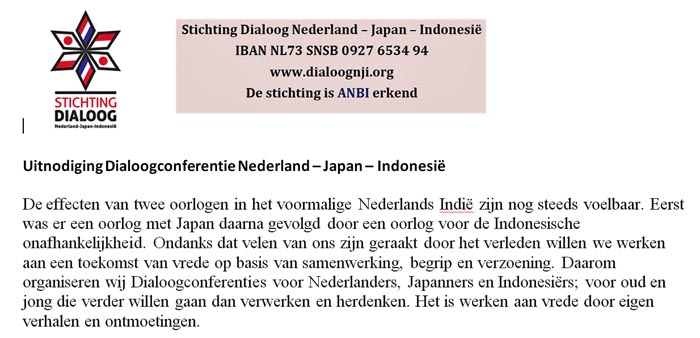 Thank you very much for your comment for the Dialoog conference. I am the chair of the Stichting Dialoog NJI. I am sorry that I could not answer you much earlier and that write this in English. You asked if you should come to the conference with your Japanese and Indonesian colleagues. It would be great if you would. But Boeroeng already wrote there is no MUST in this. We are a group of people(Japanese/Dutch/Indonesian) who try to learn from one another and try to change negative history to positive future. I am sure you would be very satisfied if you spend a day with us.