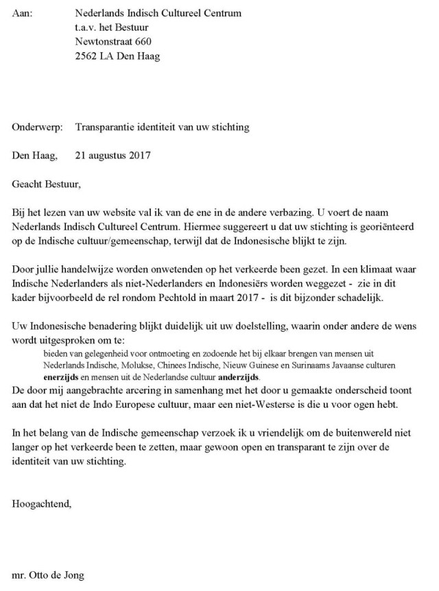 Otto de Jong is van mening dat het Nederlands Indisch Cultureel Centrum geen Indische organisatie is. Vandaar dat hij deze brief schrijft.