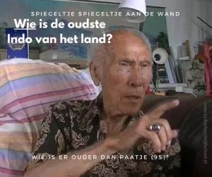 Waar en wie zijn onze oudsten? Indo is voor veel mensen een gewoon woord. Voor anderen heeft het een scherpe betekenis: In Nederland Door Omstandigheden. Wie is de oudste van Nederland?Paatje Phefferkorn vond ik oud: 95 jaar. Maar ik heb ook ooit een honderdplus mevrouw ontmoet, dus misschien zijn er nog veel meer honderdplussers. Indische Schrijfschool