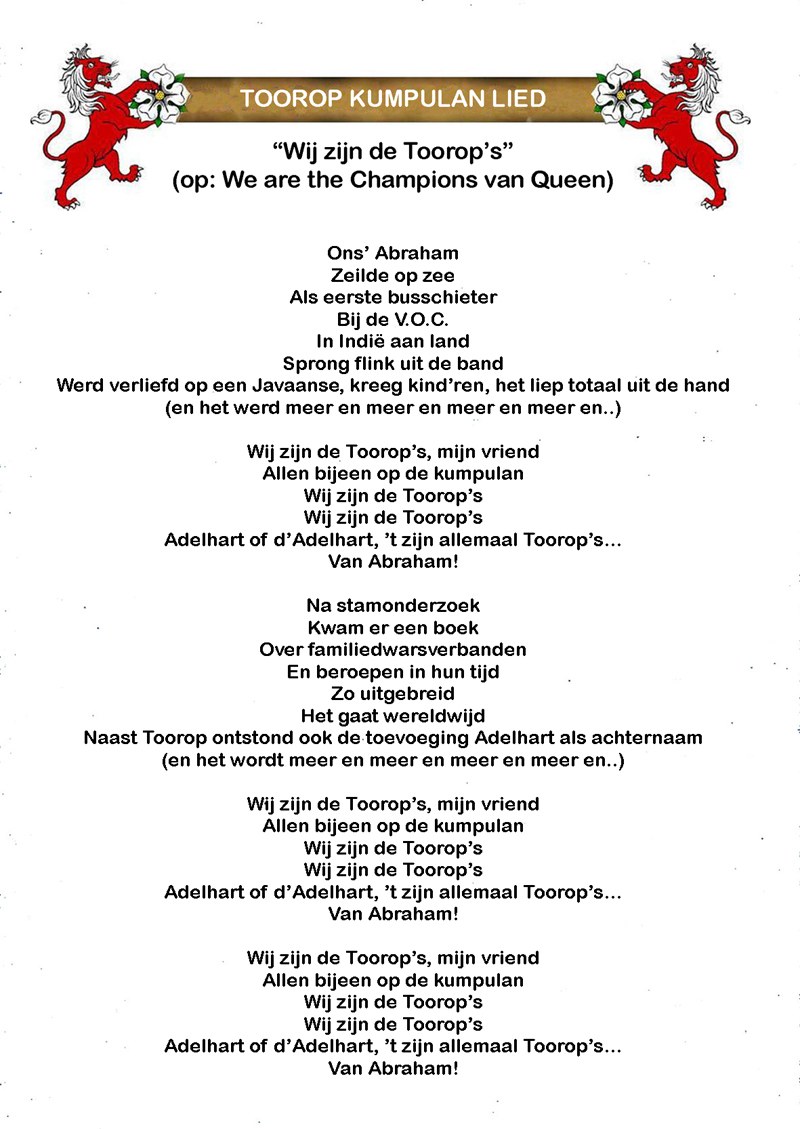 Wat bijzonder om zo veel familie bij elkaar te zien, hier op de Toorop-kumpulan. Sommige van ons zijn nabije familie: Broers, zussen, ouders, kinderen. In andere gevallen lijkt het soms wel of we stotteren. Zo zullen veel mensen hier op de Toorop-kumpulan achter-achter-achter-achter-achter-neven en nichten van elkaar zijn. Sterker nog, we dragen drie achternamen: Toorop, de Adelhart Toorop en d’Adelhart Toorop.