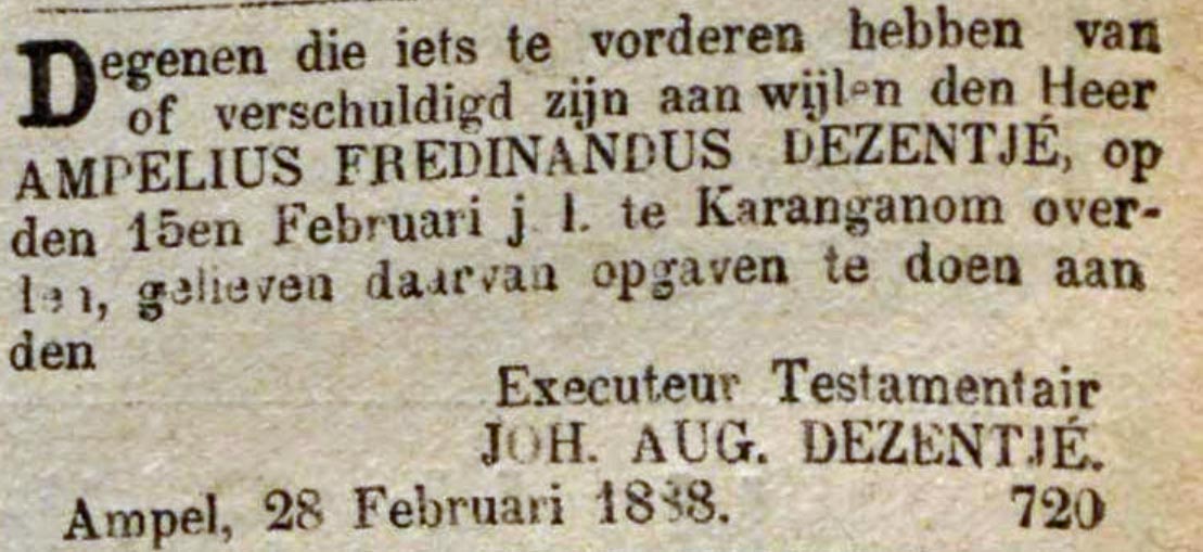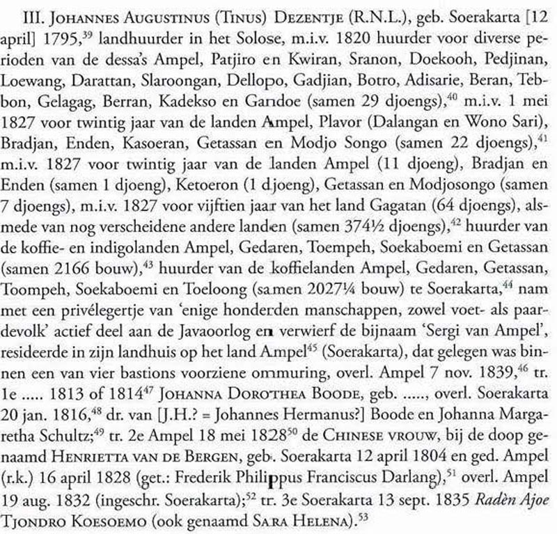 B… je bent heel goed bezig geweest met de clan Dezentje. Klasse, want het is een heidens karwei om al die nazaten op een rijtje te zetten en het is je aardig gelukt…. Op Karanganom schijnen nog enkele nazaten aanwezig te zijn, doch mijn bronnen hebben ze nog niet te pakken en diegenen die de enkele graven aldaar verzorgen, weten niets tot bijna niets over hun moyang buyu. Komt tijd komt raad. En geduld.