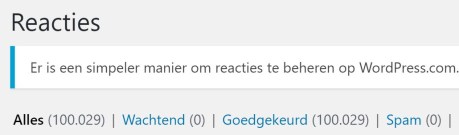 Jan…. ik maakte de fout te denken dat wordpress de reacties van elders meegenomen (weblog.nl) en per september 2011 ingevoerd niet had meegeteld. Maar dat doet men wel … dus alle reacties in het archief gedaan tussen januari 2005 en september 2011 zijn al opgenomen in die 100.000.