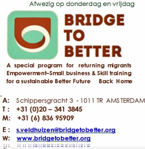 Graag zouden wij ons willen voorstellen. Wij zijn Bridge to Better, een ANBI-stichting, en helpen ongedocumenteerde mensen bij vrijwillige terugkeer naar hun vaderland. In ons traject krijgen deelnemers training en coaching, waarna ze een kleine business op kunnen starten. Daarnaast zoeken we ook altijd stage plekken, zodat de deelnemers werkervaring kunnen opdoen en zich ontwikkelen op het vlak waar ze wat mee willen gaan doen als ze terug zijn.