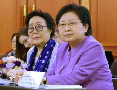 South Korean Gender Equality and Family Minister Chung Hyun-back (right) attends a meeting in Seoul in November to promote documents related to ‘comfort women’ to be nominated for UNESCO’s Memory of the World Register, along with Lee Yong-soo, who was forced to work in Japanese wartime military brothels. | KYODO