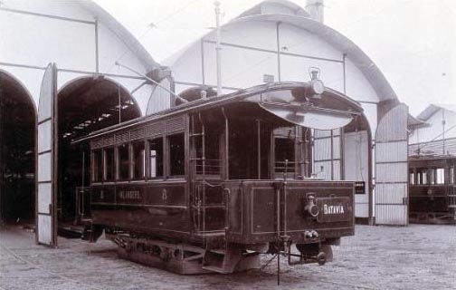 ca 1899 Tramwagon, met als opschrift Batavia en Inlanders, bij remise. Prentenkabinet Leiden