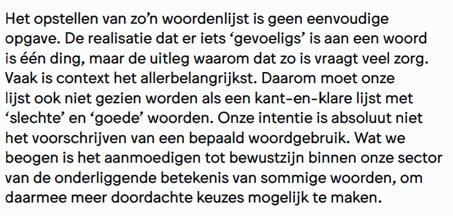 Het is een inventarisatie van woorden waar het publiek moeite mee kan hebben en met een poging te omschrijven waarom.