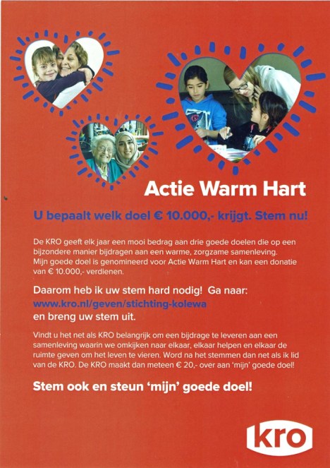 Elk jaar geeft de omroep KRO een mooi bedrag aan drie goede doelen die op een bijzondere manier bijdragen aan een warme, zorgzame samenleving. De stichting Kolewa is genomineerd voor deze Actie Warm Hart en maakt kans op een donatie van maar liefst 10.000 euro.