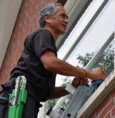 Helmonder Eric Flohr (58) noemt zichzelf ‘Floor, de vrolijke ramenwasser’ en zijn humeur is altijd opperbest: “Humor hoort gewoon bij het vak van glazenwasser. En ik ben ook echt gelukkig nu: ik heb ontzettend veel vrijheid. Voor mij is vrijheid niet dat je altijd met een biertje en een joint op de bank ligt, maar dat je kunt doen wat je het leukst vindt.”    indebuurt Helmond