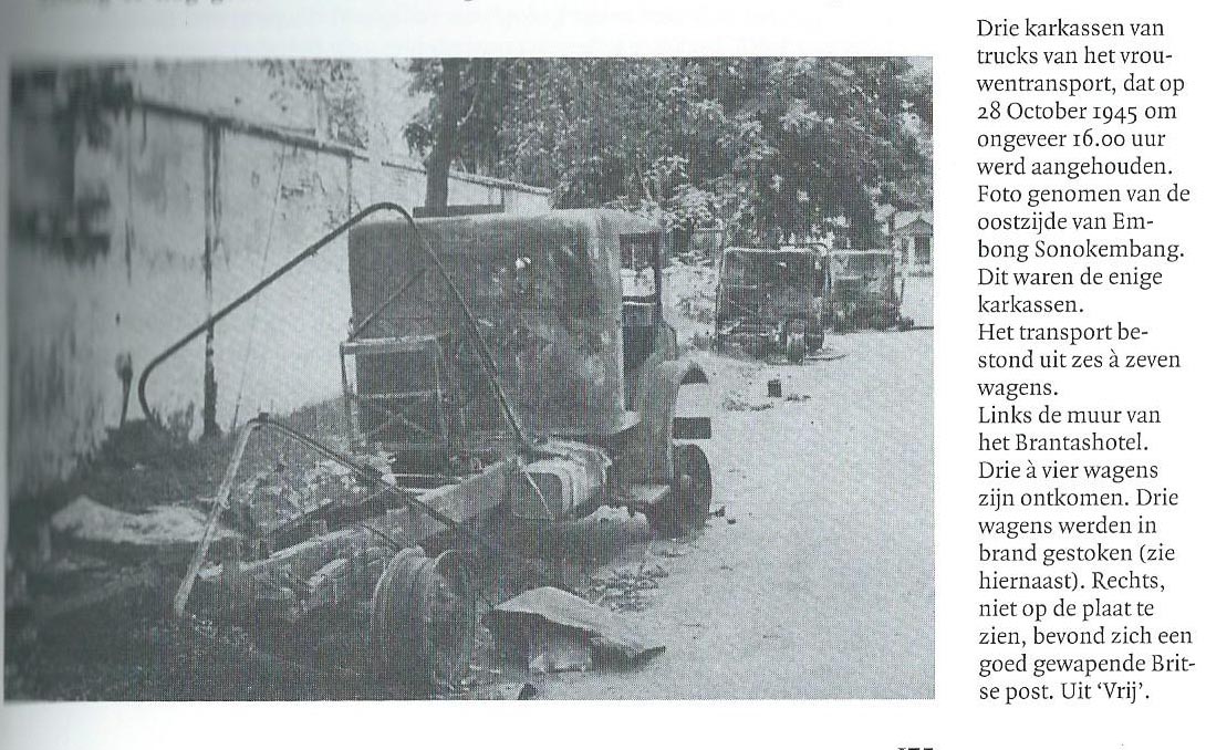 ” The Indonesian literature in general (and interestingly also van Delden 1995:195, 290) omits to mention this terrible massacre of women and children (Goebengtransport). One exception is Kadim Prawirodirdjo (1987:31) who assuming like Wehl (1948:57) Oey Hong lee (1981:43) and Giebels (1999:388) that the Convoy was coming rather going to Darmo, claims it was perpetrated in reaction to the Allied raid on Kalisosok goal to free Captain Huyer and other Dutch prisoners. Another exception is Roeslan Abdulgani (1975:28) who expresses his regret at it. As far as I was able to find out, the convoys from Darmo to the port only started after an agreement was concluded between Sukarno and (gen) Hawthorn (Commanding Officer 23rd Infantry division)”.