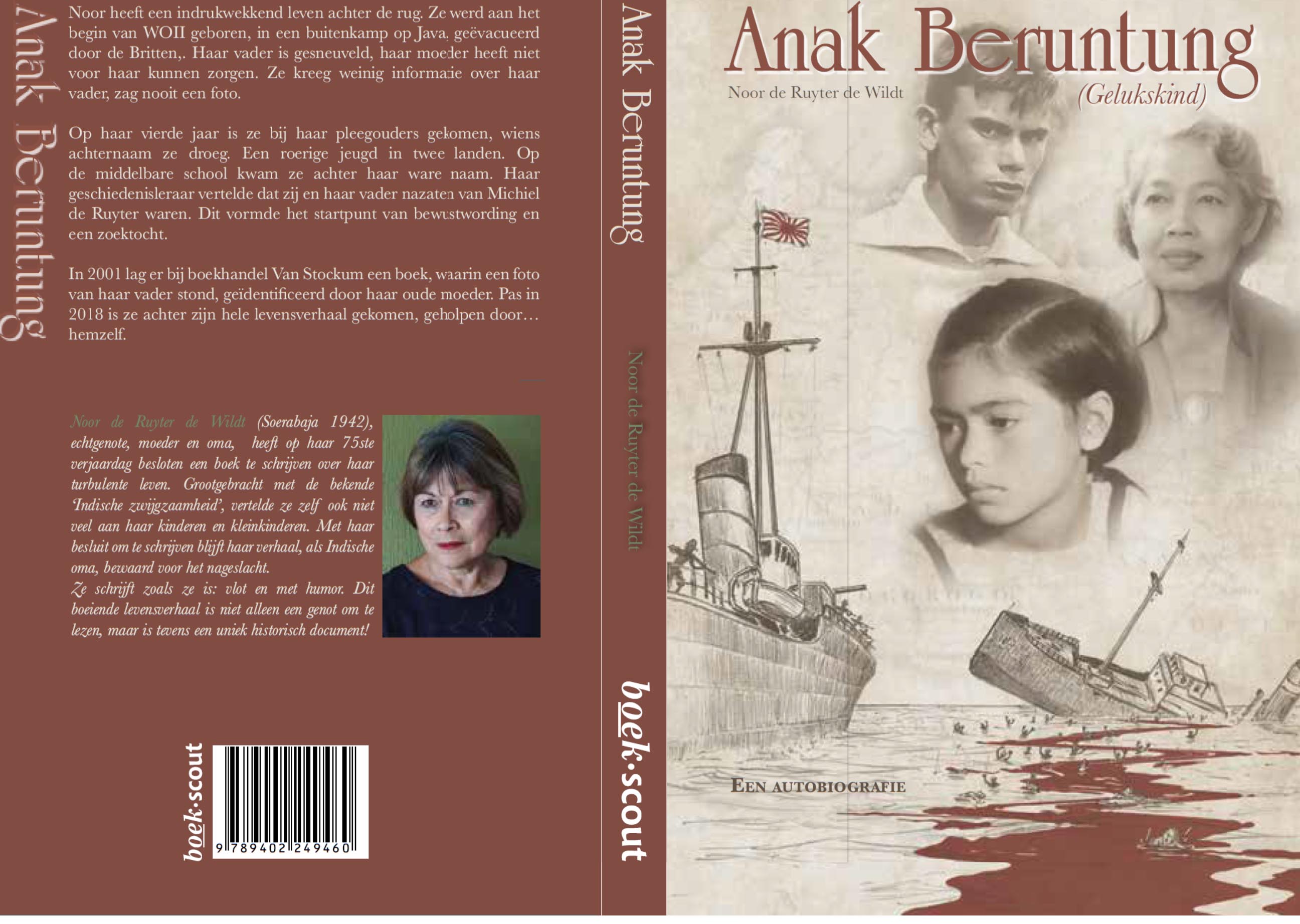 Anak beruntung betekent gelukkig kind nou vind ik die baby die in 1942 geboren werd niet zo,n gelukkig kind ,ga maar na vader verdronken bij een grote scheepsramp ,haar moeder moest het alleen rooien in een door Japanners bezet land geen inkomen waarschijnlijk ,tot haar 4 e onder de hoede van een niet zo,,n makkelijke oom en tante ,volgens mij zijn er grote overeenkomsten met de situatie van Hans Boers ,wiens broer gesneuveld is tijdens de slag om de Javazee en die zijn vader ook nooit heeft gekend en die ook in 1942 is geboren in Soerabaja en ook al is opgevoed door een oom en tante ,volgens mij heb ik een foto van haar vader gezien met een racefiets en heeft ze een lintje uitgereikt gekregen uit handen van Silvraire Delhaye .Nu is mw Noor Ruyter de Wildt gelukkig ,gelukkig maar ,ik hoop van ganse harte dat het boek goed verkocht wordt ( Ik koop hem zeker )