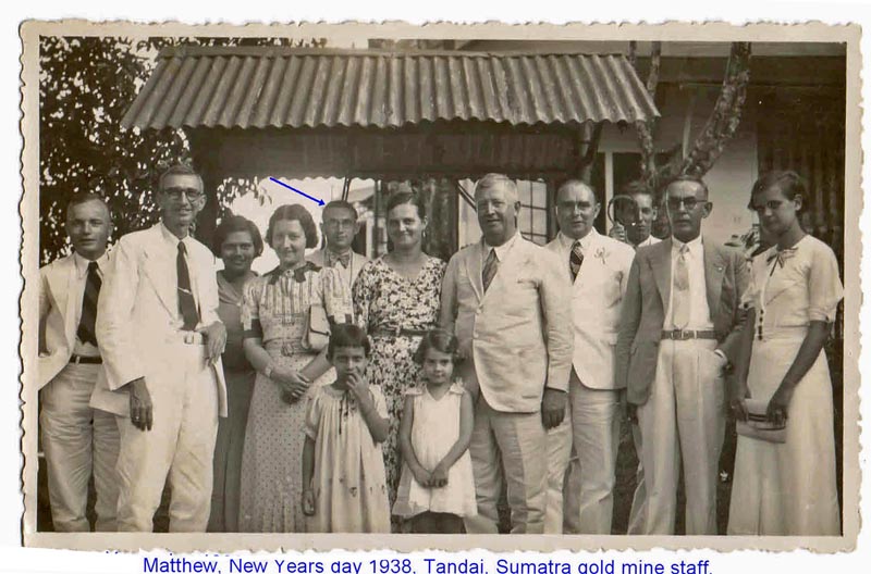 He spent many years in Internee in Japanese camps but prior to this, was the only English man working as a gold mining engineer for a Dutch company situated north of Benkolen. The main mine was called Tandai, which leads me to the attached photographs. One is of Matthew and other is a group photo, after celebrations of New Year in 1938 with what we presume are other Dutch mine management staff and their families. I do know from an article in the London Illustrated News, June 14 1941, one of his Dutch colleges was a Mr B. P Van der Vaart and a Swiss sculptor Paul Vogt was with them, prospecting in Sumatra.