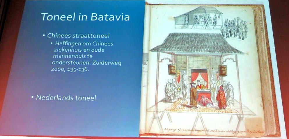 Het Chinese straattoneel neemt daar een prominente rol in. Blijkbaar keken Nederlanders er graag naar. Op straat wordt een stellage gebouwd en je betaalde om te mogen kijken. Zo werd er geld opgehaald voor ‘goede doelen’. Verbinding toneel binnen Europa en Batavia was slechts sporadisch aanwezig.