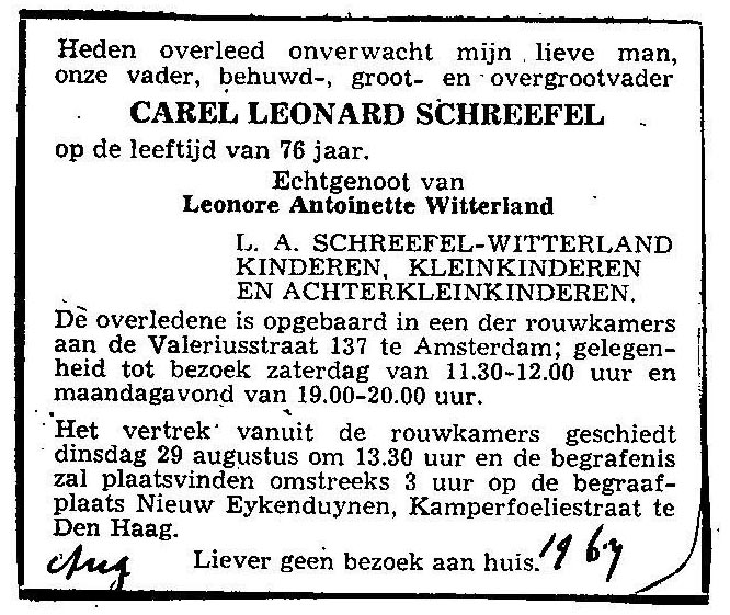 Carel Leonard Schreefel overleed in Amsterdam, maar werd begraven in Den Haag. Hij huwde in 1916 met Leonore Antoinette Witterland, dochter van Johanna Louise Mathilda Neyhoff en Victor Juriaan Antoine Witterland, klerk en commies van het residentiekantoor te Semarang. Samen hadden ze zes kinderen.