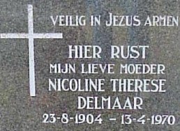 Nicoline Thérèse Delmaar overlijdt in 1970 in Den Haag. Mogelijk is ze door dochter Sylvia begraven. Nicoline, geboren in 1904 te Djokjakarta, was de dochter van Robbert Delmaar (perkeniersfamilie van Banda) en Jacqueline Rijfkogel, ook uit Banda .