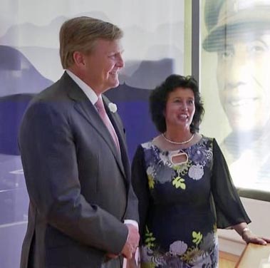 (foto is van Omroep West.  Koning Willem Alexander en Yvonne van Genugten, directeur van het Indisch Herinneringscentrum)